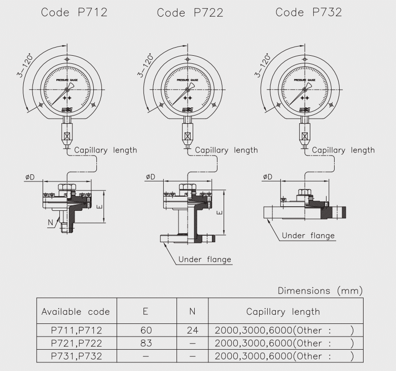| Remote mounting (capillary) | Có (P712/P722/P732): 2000, 3000, 6000 mm (hoặc tùy chỉnh) |