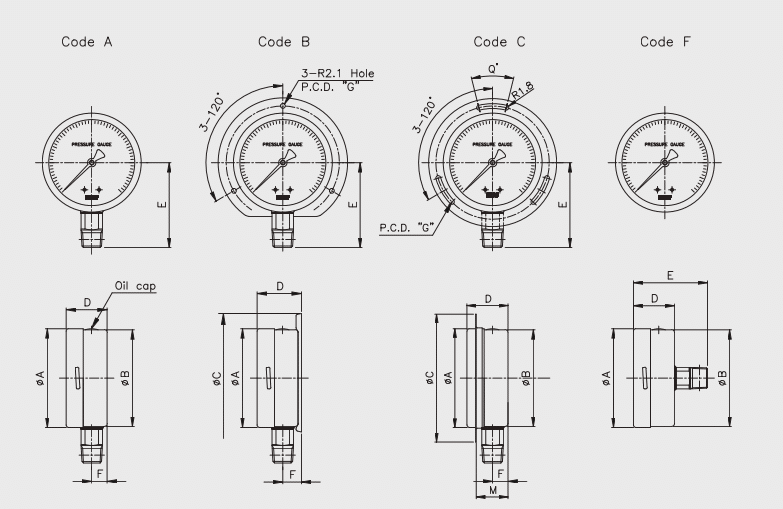 | Ống Bourdon | 63 & 80 mm: C-type (<6 MPa), Helical (≥6 MPa) |
