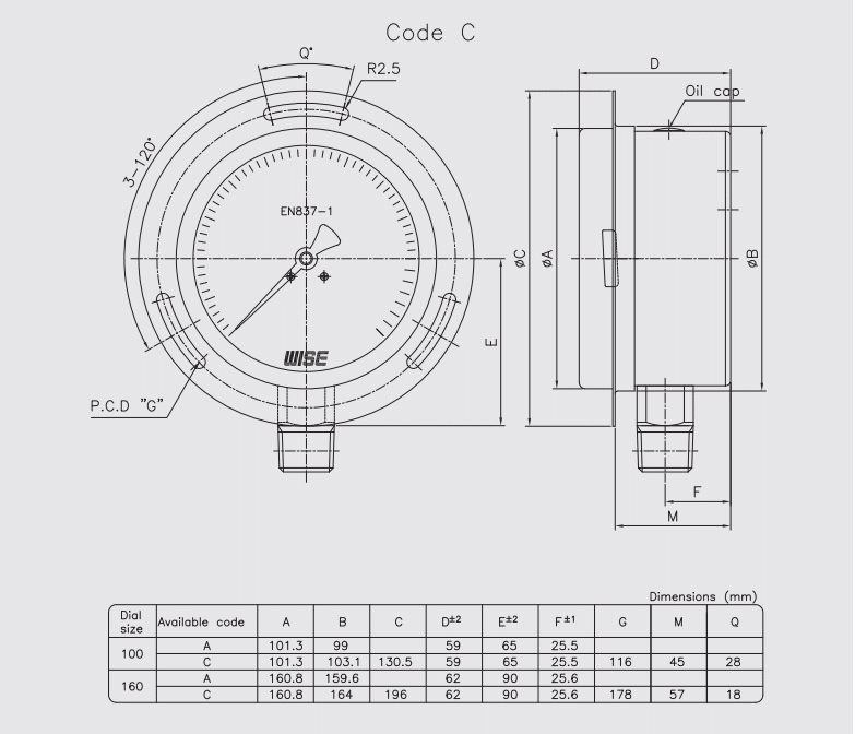 Kích thước của Đồng hồ đo áp suất Wise P256