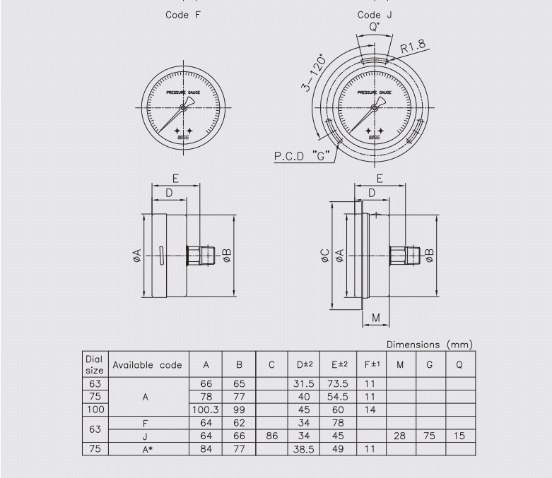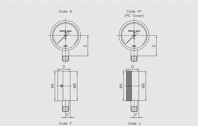 | Kết nối áp suất | Nickel plated brass (chuẩn); 316SS (chỉ 63 mm F/J) |