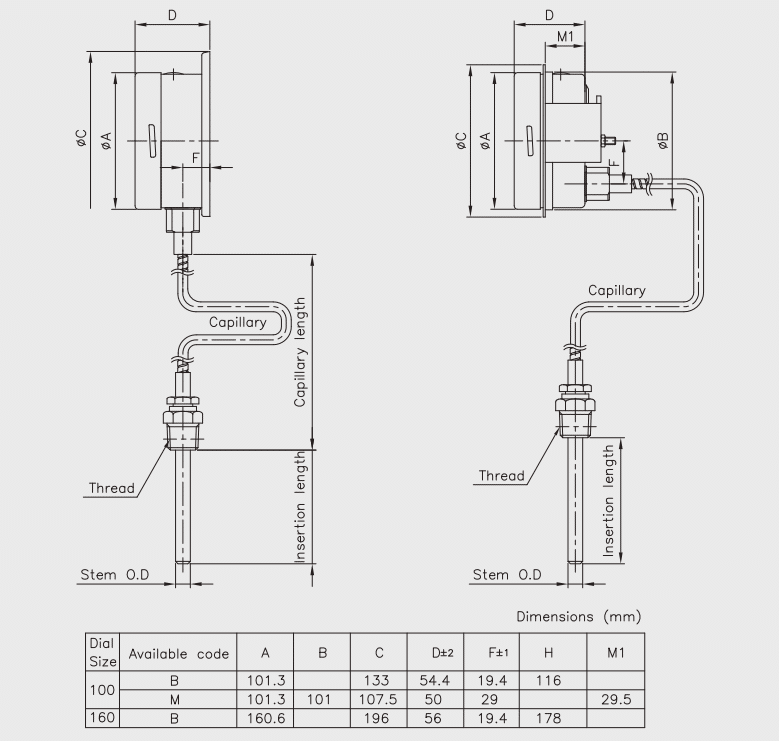 - Áp lực truyền qua ống mao (capillary) lên cơ cấu đo trong mặt đồng hồ. Ống mao dẫn truyền sự thay đổi áp lực từ cảm biến đến bộ đo cách xa vị trí đo.