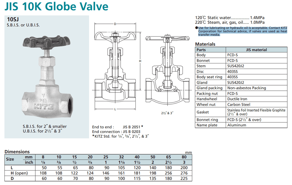 Thông số kỹ thuật Van cầu KITZ model 10SJ