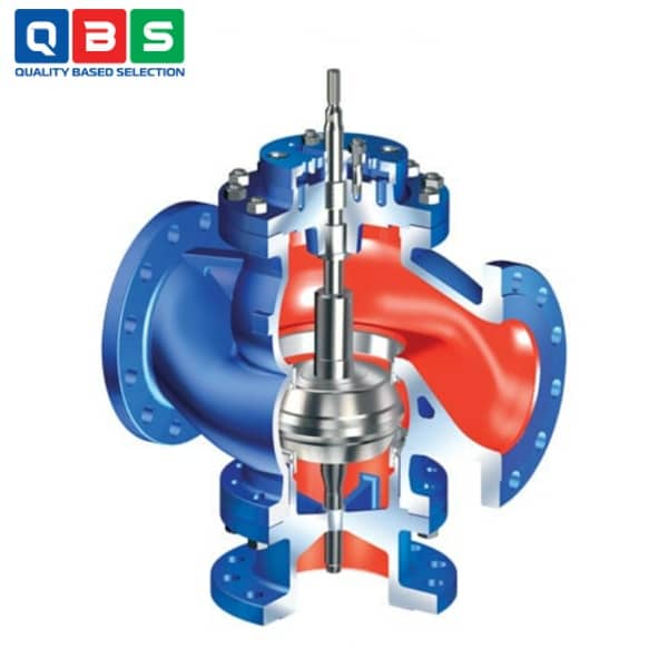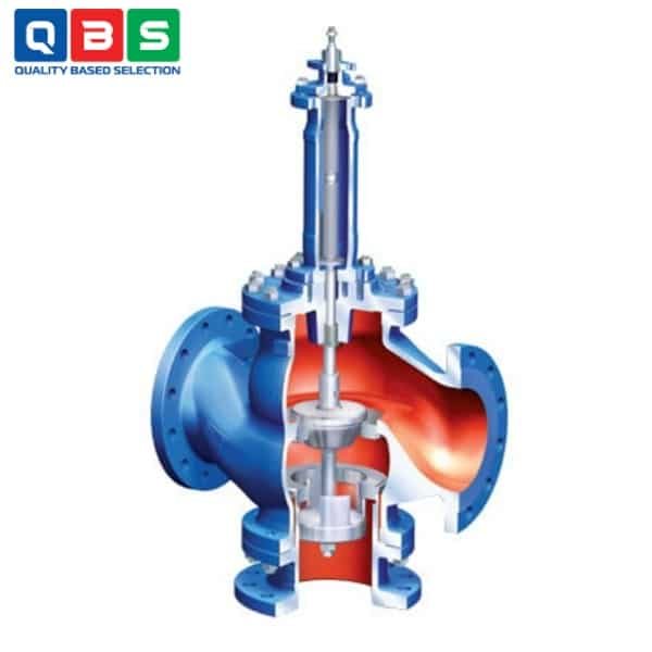Van 3 ngả này dùng để trộn (mixing) hoặc phân dòng (diverting) lưu chất (nước, hơi, khí…) bằng cách điều chỉnh vị trí thân van hình nón (plug) di chuyển lên/xuống nhờ bộ truyền động khí nén hoặc điện.
