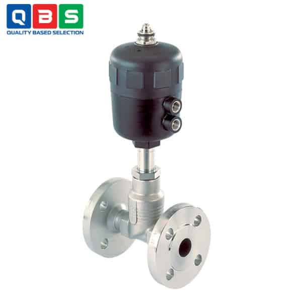 - Điều khiển bằng khí nén: Bộ actuator khí nén (thường kết hợp positioner điện-khí nén như Type 869x/879x) nhận tín hiệu điều khiển (4-20mA hoặc PID) → thay đổi áp suất khí nén → di chuyển piston → kéo/nén lò xo → đẩy/kéo trục spindle → nâng/hạ nón van để thay đổi độ mở ghế van → điều tiết lưu lượng chính xác.